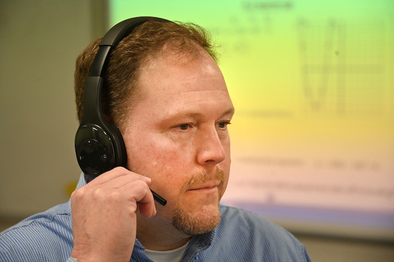 In Pierson’s open ear, he’s fielding questions from the rest of students who are masked up in the classroom with him.
