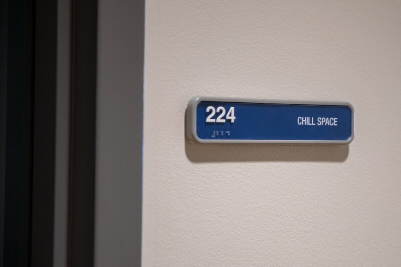 The desks at Skyline, which is run by Denver’s community mental health center WellPower, have bungee rubber bands that stretch from one chair leg to the other so kids can put their feet on them and bounce as they study fractions or read aloud. Each child gets a plastic rainbow wiggle slug they silently twist and curl in their palm, helping them relieve anxiety. Children can use standing desks or “wobbly” stools inside of regular chairs. There is a “chill room” and a “peace room” containing bean bags and swings where students can hang out if the classroom gets too stressful.