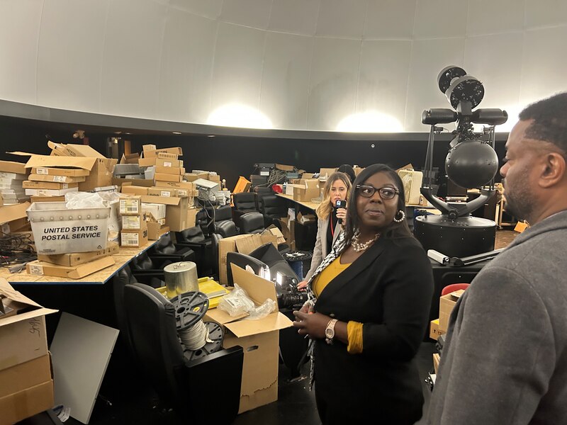 Arlington Middle School Principal Iesha Billups stands in the school’s planetarium, which is currently used as storage space but will be restored if voters approve the $410 million ballot question in May. (Amelia Pak-Harvey/Chalkbeat)